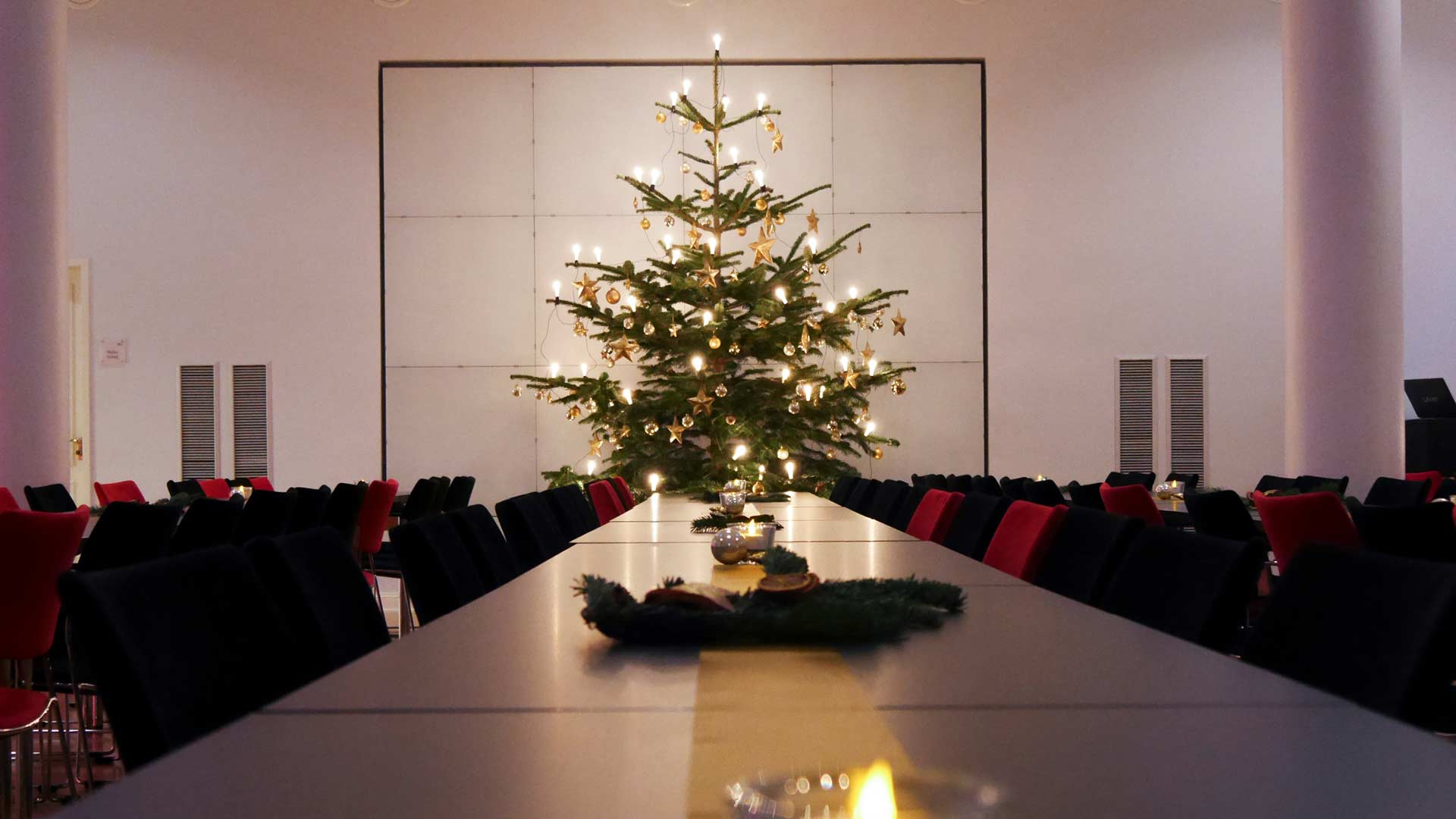 Dekoration: Zu Weihnachten lieben wir es, die Location festlich zu schmücken und einen eindrucksvollen Tannenbaum im großen Saal aufzustellen.